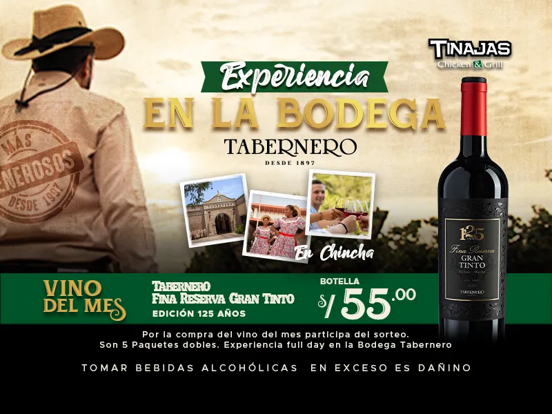 Por la compra de 1 Vino Gran Tinto Fina Reserva 125 años a S/ 55.00 soles puedes participar del sorteo de 1 de los 5 paquetes dobles a “La Bodega Tabernero” en Chincha. El sorteo será en Septiembre y se comunicará en nuestras redes sociales. Serán 5 ganadores.